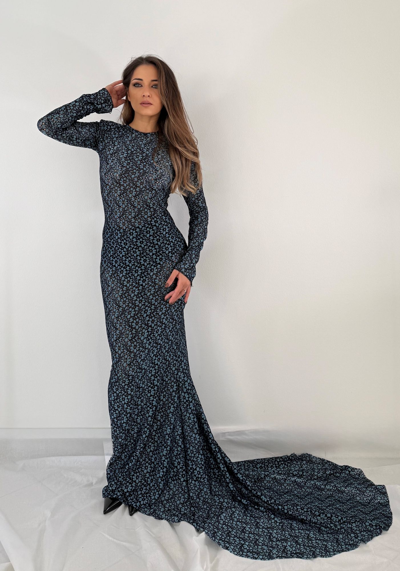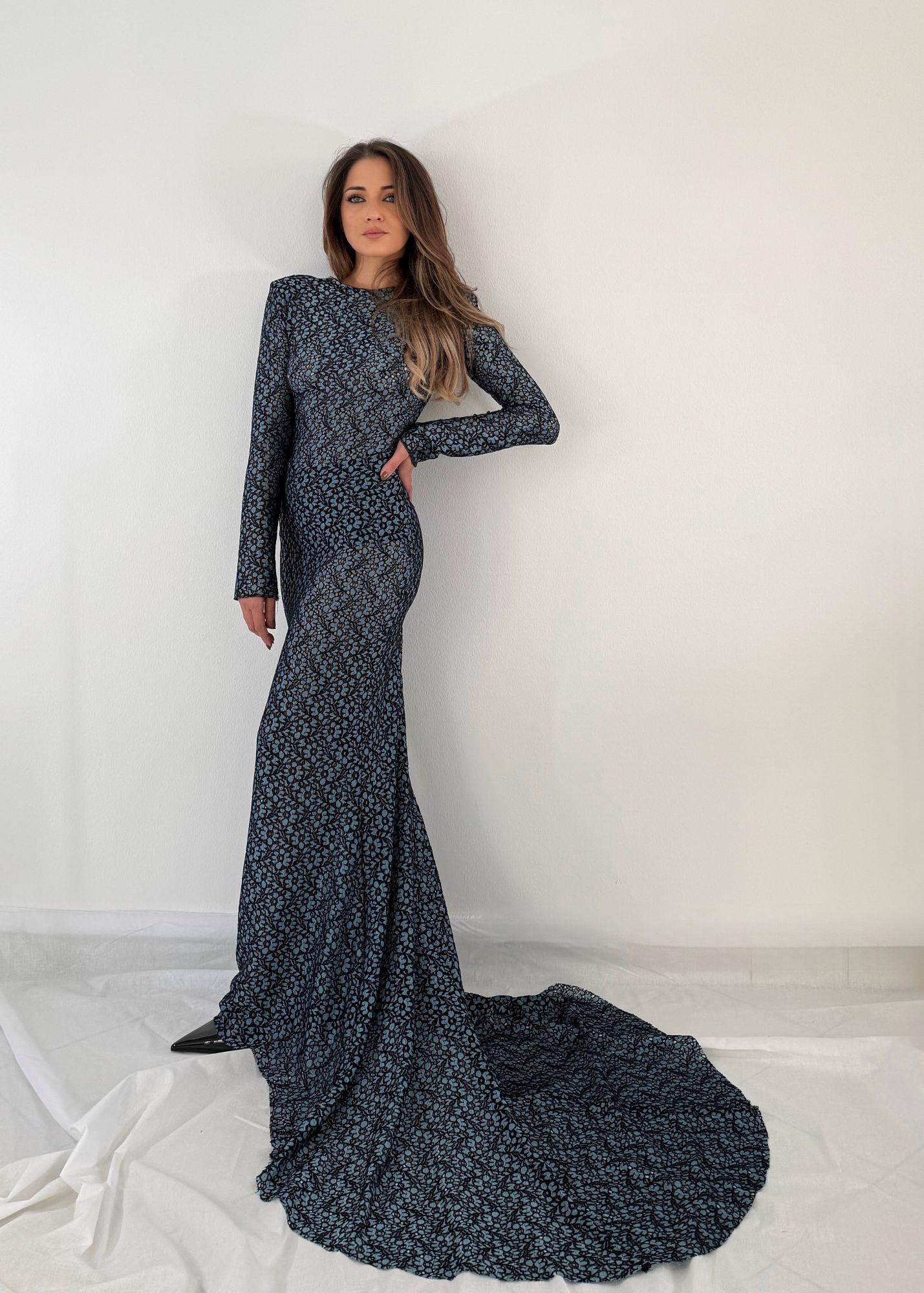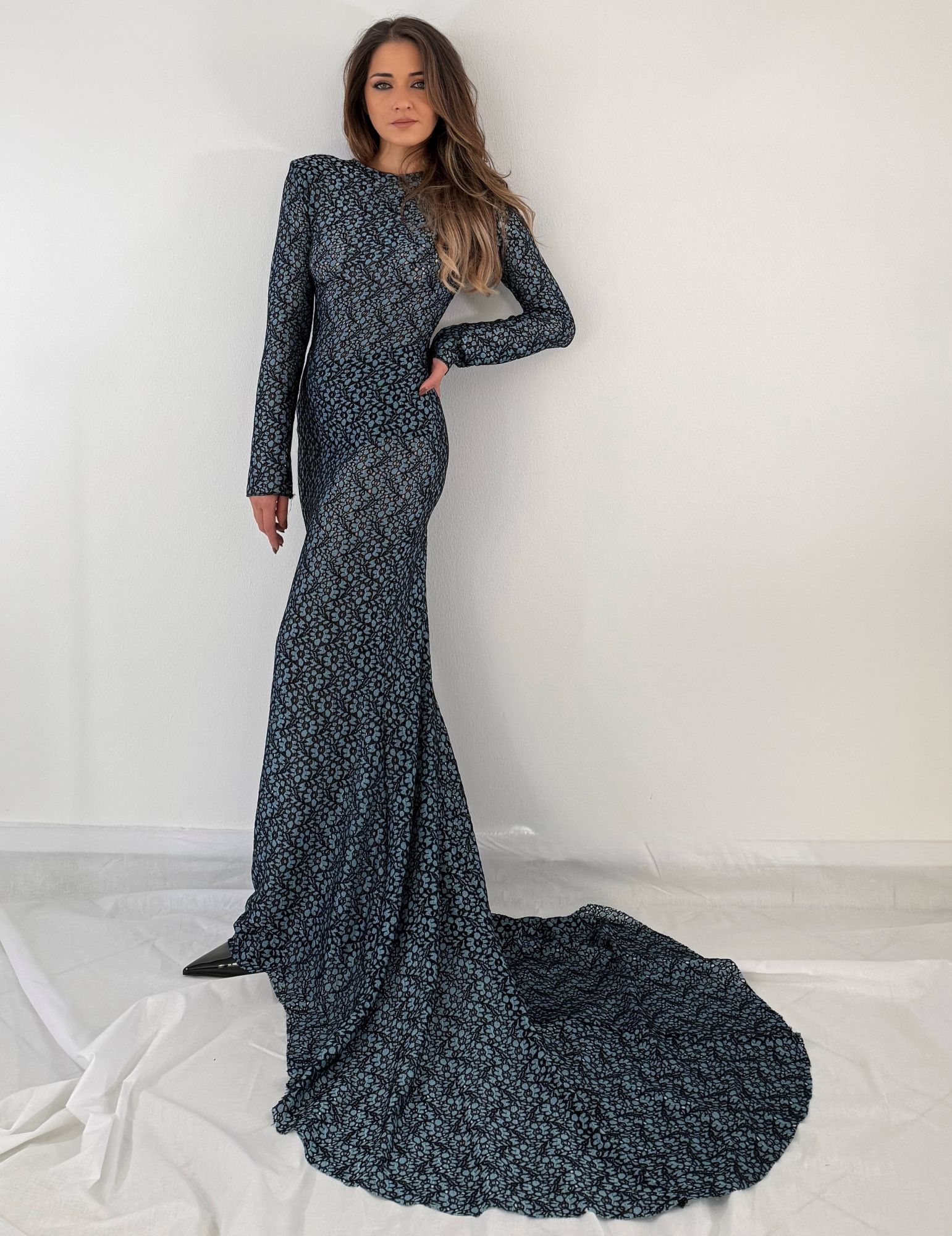 Long mermaid dress in stretch macramé lace with black relief on sugar-paper blue background.