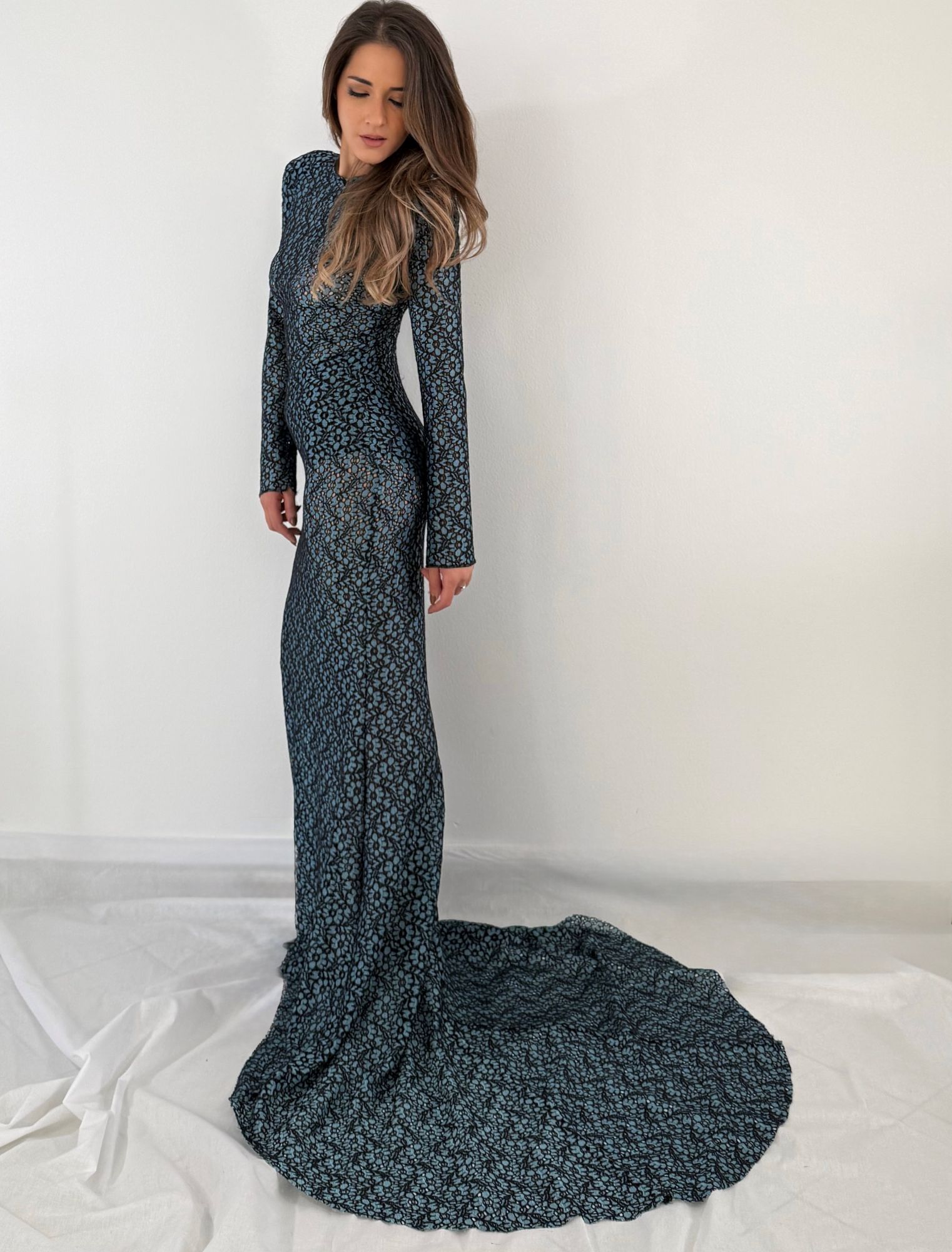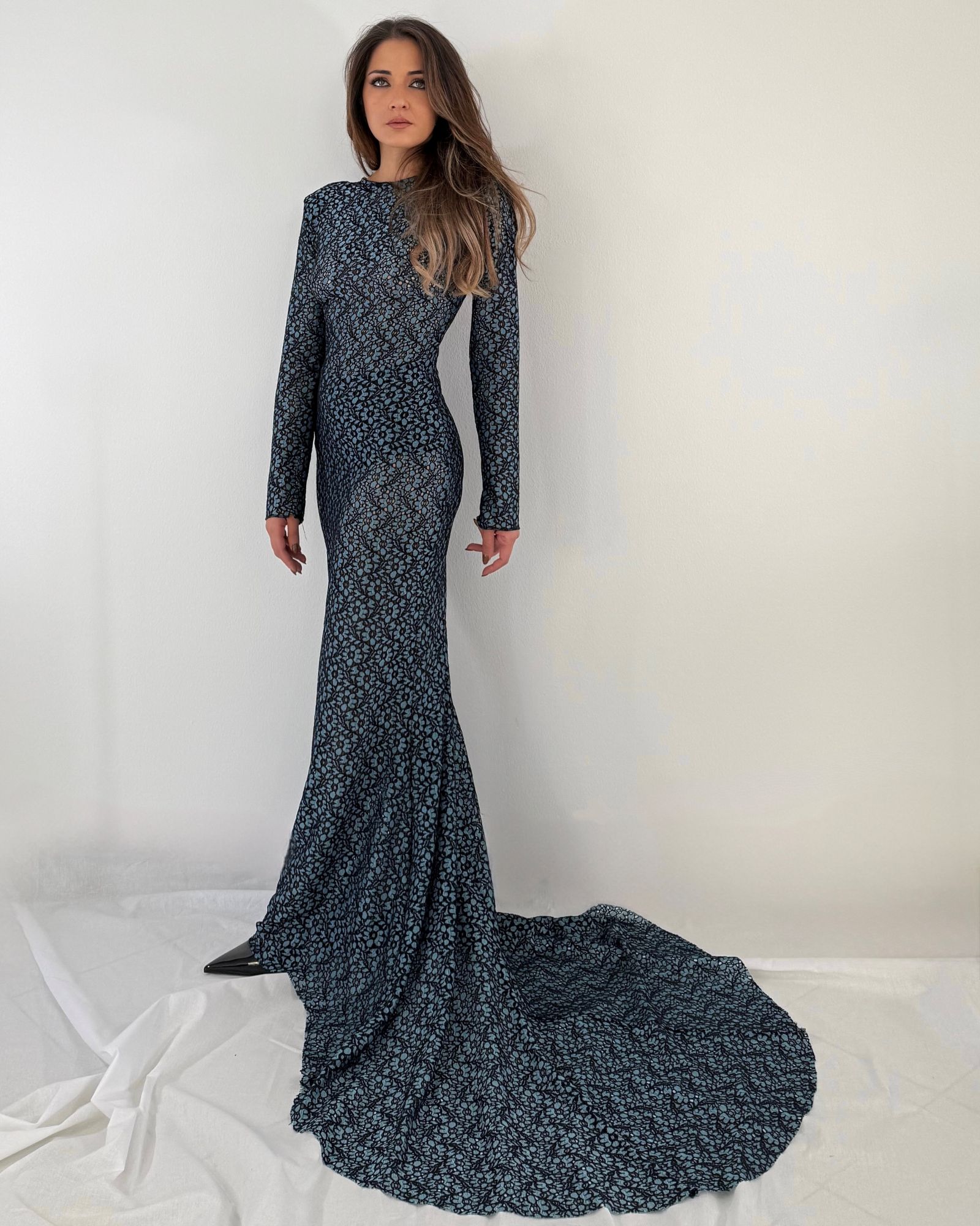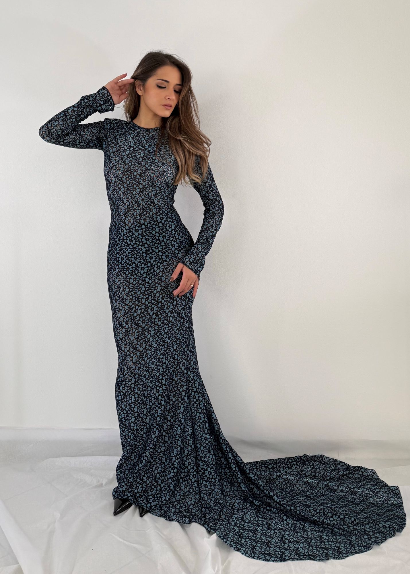Long mermaid dress in stretch macramé lace with black relief on sugar-paper blue background.