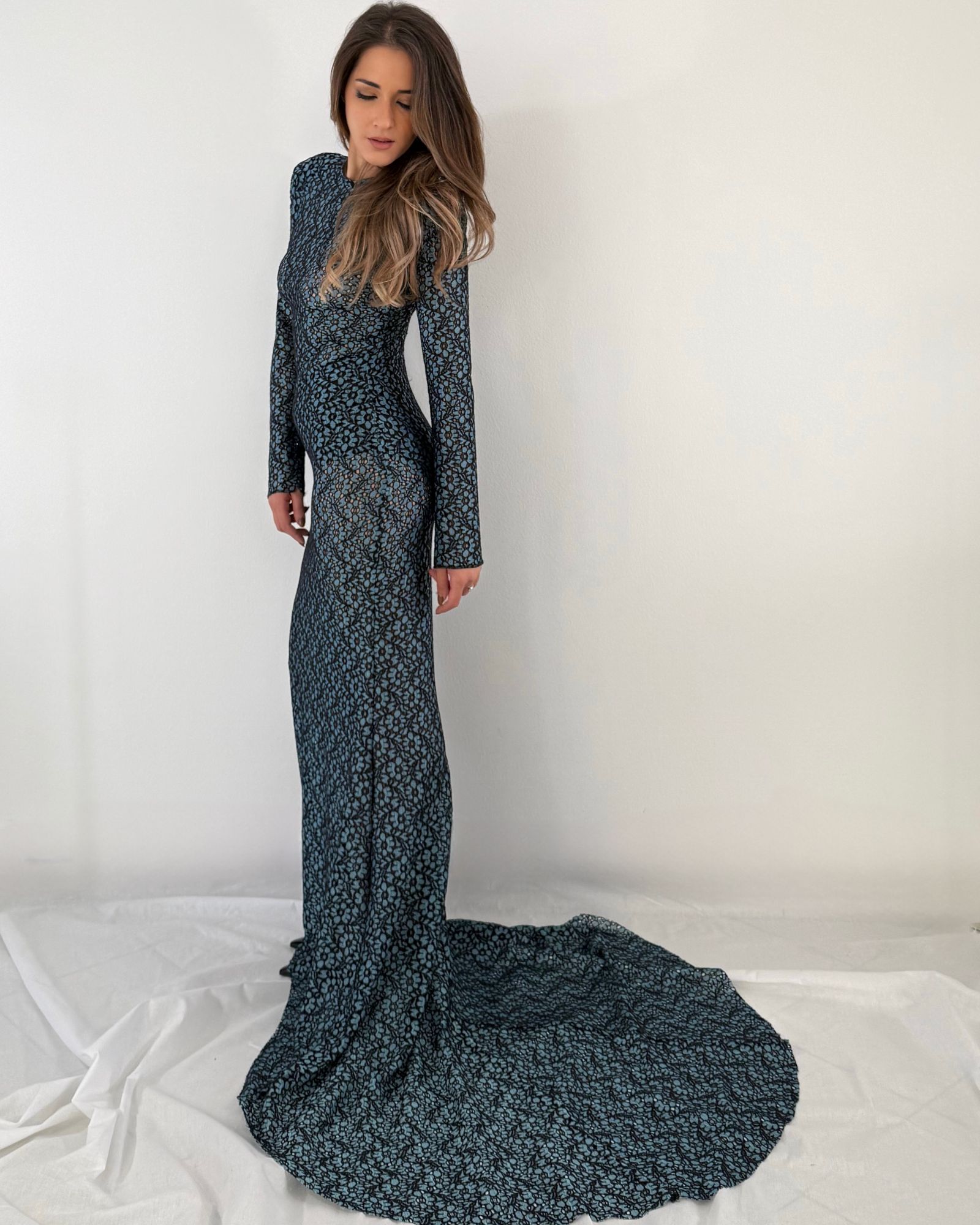 The mermaid cut, long sleeves and integrated shoulder structure define an elegant, assertive profile — ideal for ceremonies and special occasions.