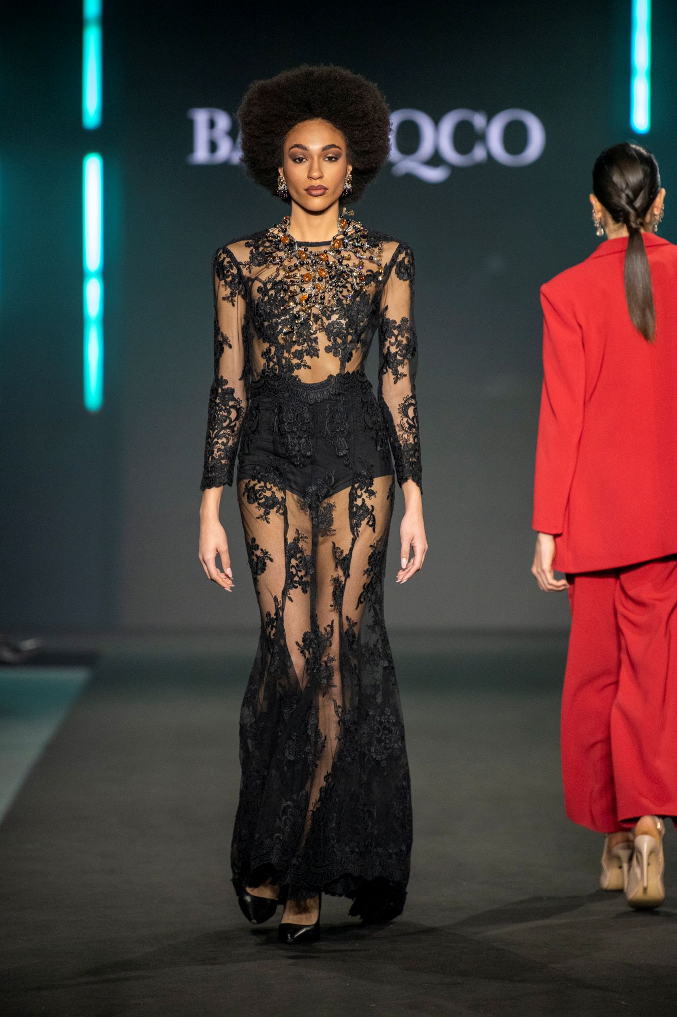 Crafted in black rebrodé lace, it envelops the body with a mermaid silhouette that enhances the figure in a sophisticated way.